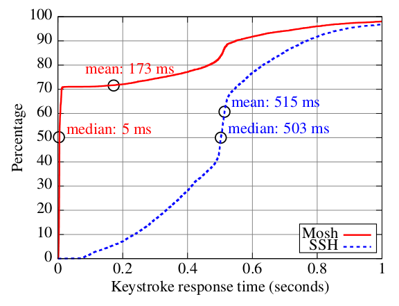 Mosh reduced the median keystroke response time from 503 ms to nearly instant (because more than 70% of the keystrokes could be immediately displayed), and reduced the mean keystroke response time from 515 ms to 173 ms. Qualitatively, Mosh makes remote servers "feel" more like the local machine!