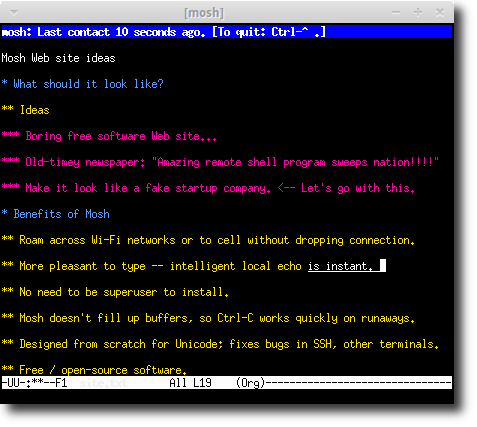 SSH waits for the server's reply before showing you your own typing. That can make for a lousy user interface. Mosh is different: it gives an instant response to typing, deleting, and line editing. It does this adaptively and works even in full-screen programs like emacs and vim. On a bad connection, outstanding predictions are underlined so you won't be misled.